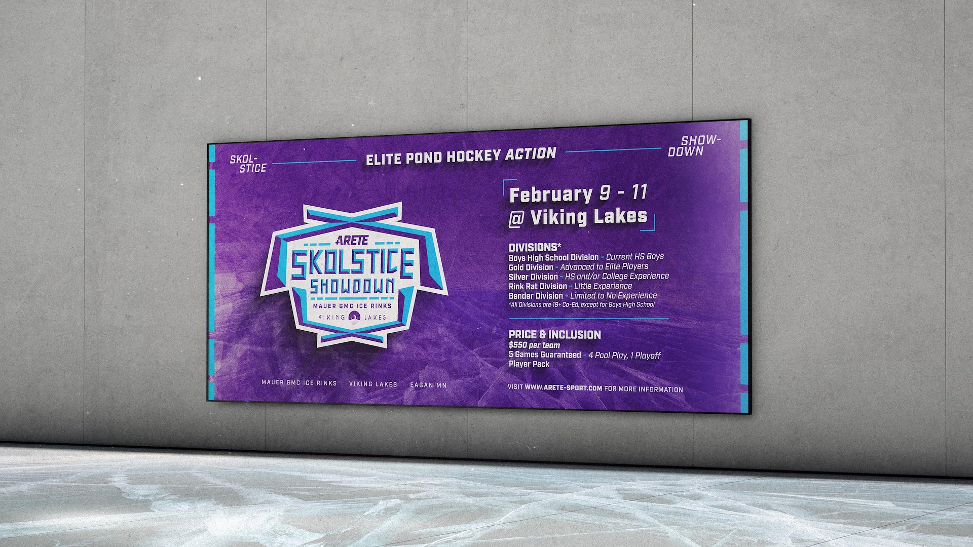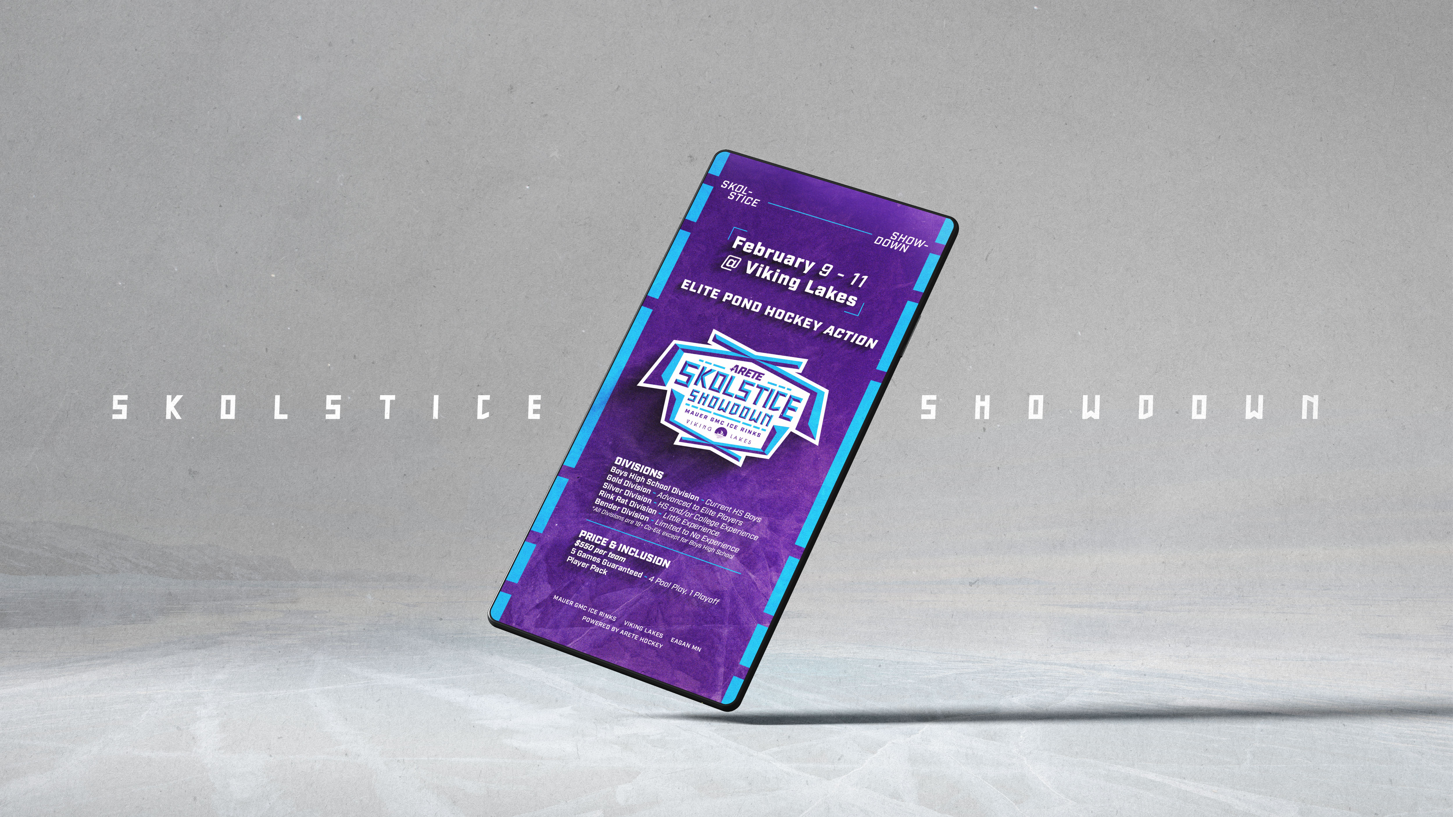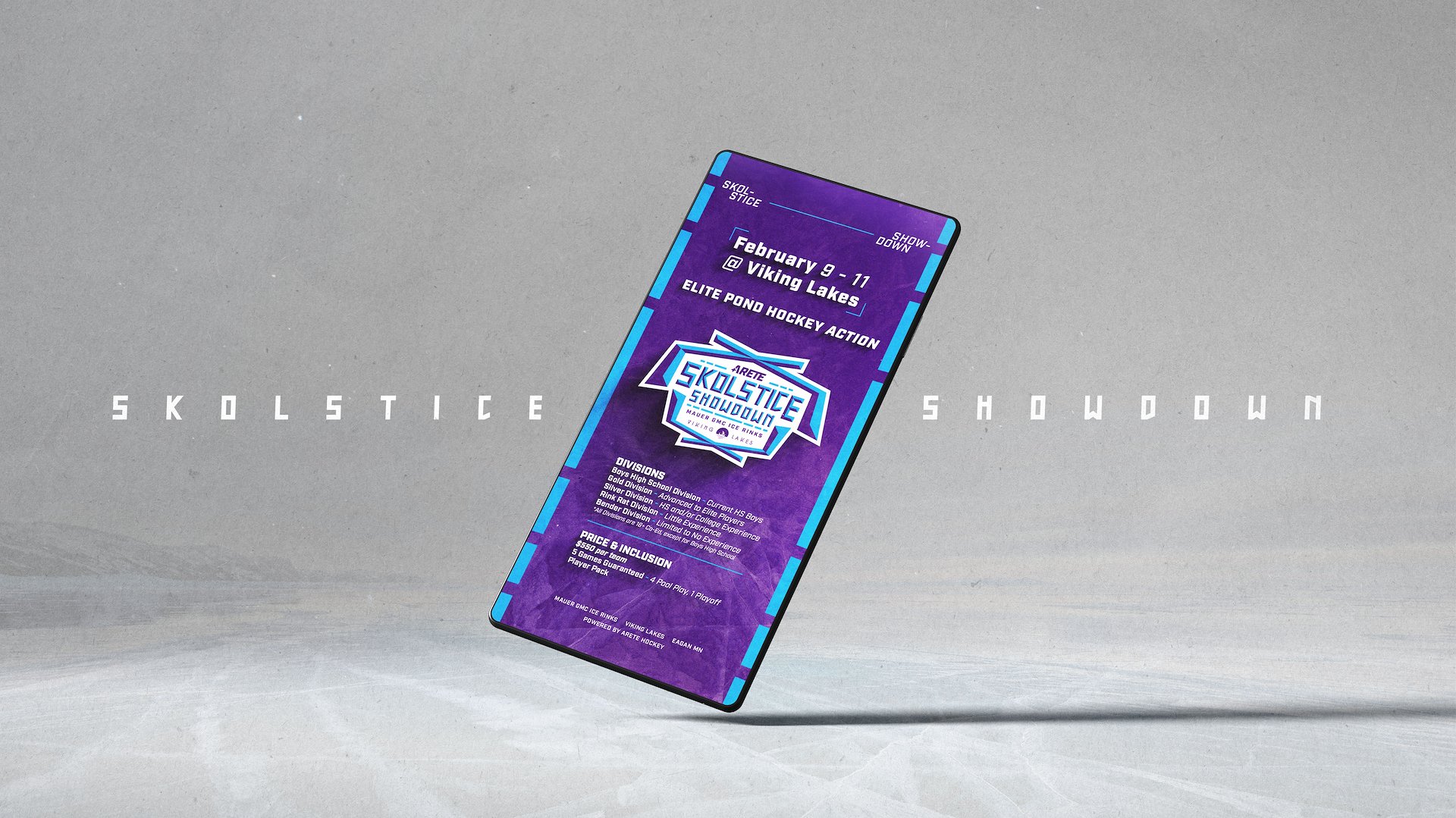 The Skolstice Showdown is a pond hockey tournament hosted at Viking Lakes in Eagan, MN. I was tasked with designing the logo and visual identity for the event, as well as mocking up apparel and designing marketing materials.